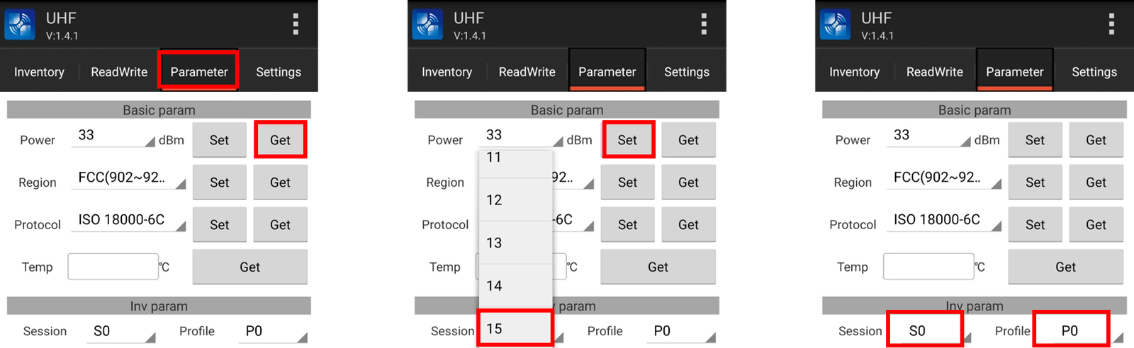 2.Select target power in “Power” and click “Set” to refresh the power settings. It is recommended to use 15dBm for encoding and 33dBm for inventory.