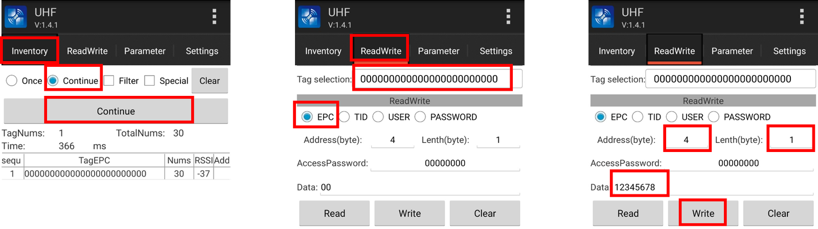 2.Enter “ReadWrite” interface, select the uncoded label “00000000” in “Tag selection”, select “EPC” mode.